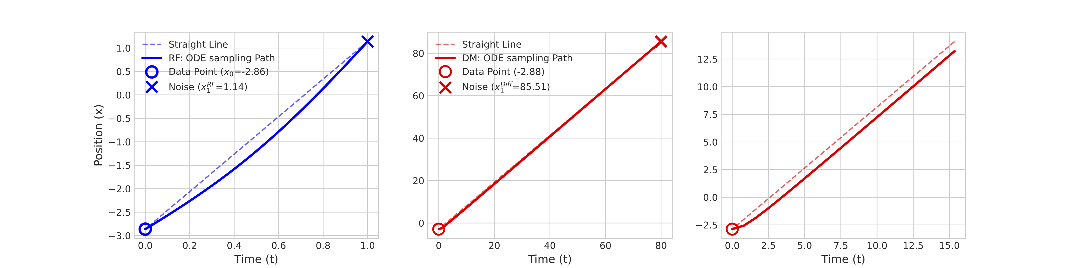 Here, we discuss one toy example to compare the learned sampling trajectories of RF and DM. Consider target data distribution , RF sampling relies the velocity function , which has analytical solution in this scenario. Recall that Take posterior expectation with respect to on both sides, we have: